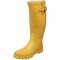 Look chic out in the rainstorm with the classic Chooka Boot Posh Dots rain boots. Molded rubber upper in a casual pull-on rain boot style with a round toe. Printed dots accent the 15 inch shaft 15 inch circumference collar with a folded rubber side gore and adjustable buckle strap with logo detail. Textile lining and cushioning insole flexible outsole. 1 1/8 inch square heel.[]